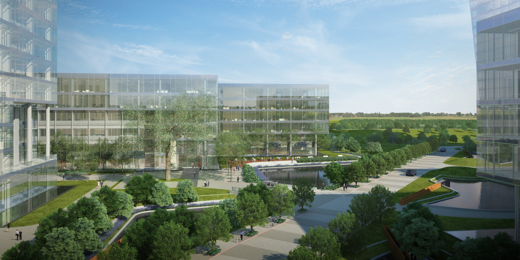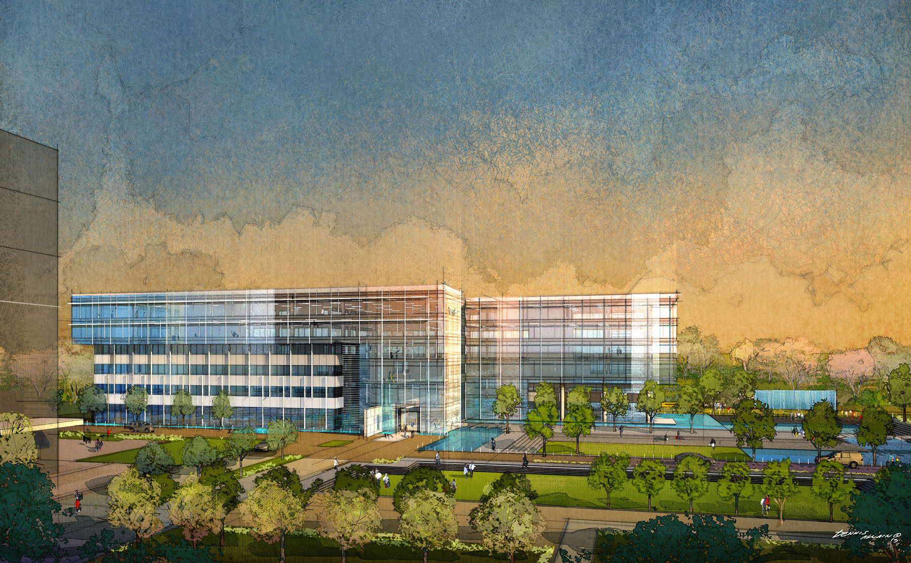 It is designed to be the first phase of a master planned development. The project was designed with a combination of curtain wall and precast facades. This combination allows for a cost-effective envelope solution. The massing responds to the position of the building on the master plan.
